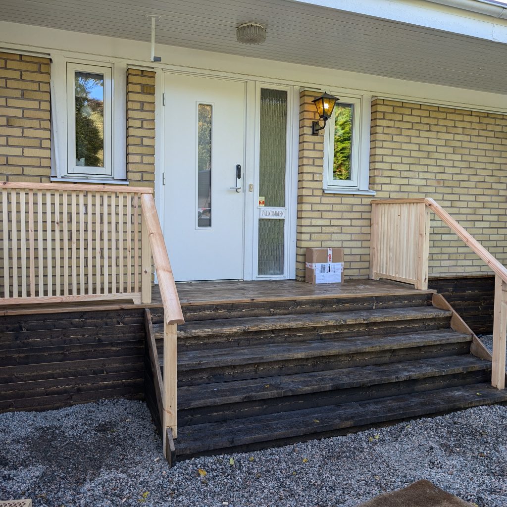 Vi rev den gamla förstukvisten och byggde upp en ny lite mindre. Ytbehandlingen är roslagsmahogny.